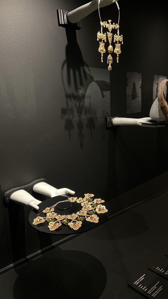 Els vestits de Gala disposats al fons de l’espai, s’acompanyen de complements suspesos per unes mans de porcellana que ens transporten a l’imaginari dalinià. Les fotografies dels vestits colonitzen el Castell establint un diàleg entre arquitectura, art i moda.
