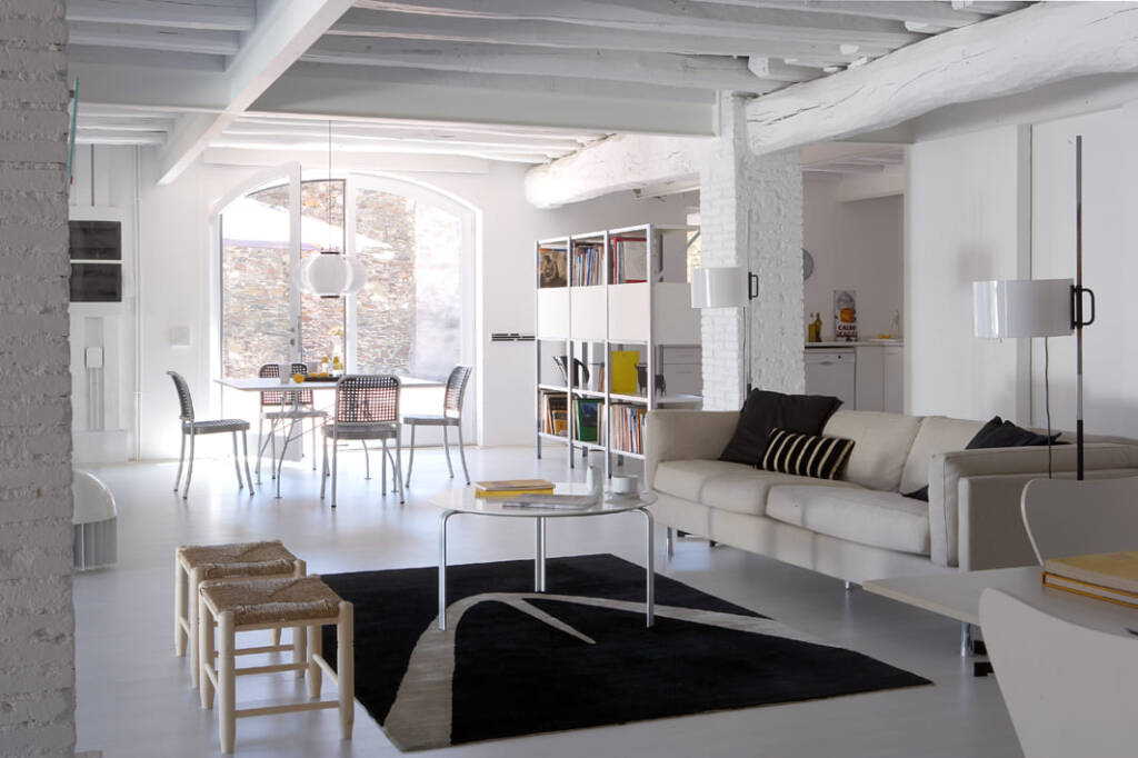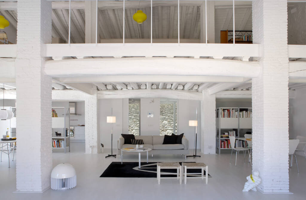 L’espai, de planta quadrada, es defineix pels 4 pilars centrals que organitzen 9 estances connectades, on menjar, estar, dormir i treballar es fa possible.